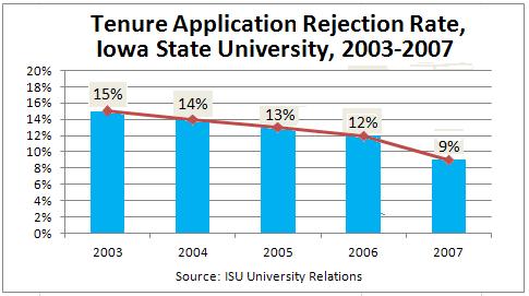 Put another way, the rejection rate for tenure applications at ISU has fallen from 15% in 2003 to only 9% in 2007: