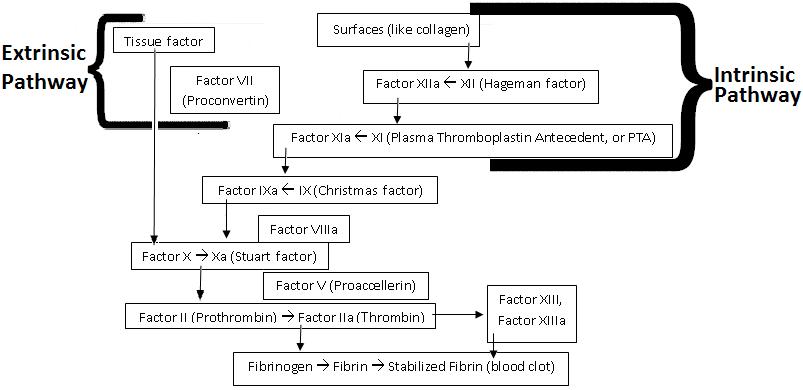 Figure 1: Rough sketch of the intrinsic and extrinsic pathways of the blood-clotting cascade: