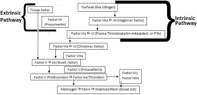 As I discussed in Part 1, Pandas contended that the blood-clotting cascade of land-dwelling vertebrates requires all of its parts–including the intrinsic pathway, the extrinsic pathway, and all of the components that the pathways share in common after they converge (i.e. from factor X onward). The blood-clotting cascade of land-dwelling vertebrates, with the intrinsic and extrinsic pathways labeled, is seen in Figure 1 below: