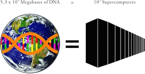 Figure 1 in their paper, reproduced above, illustrates their main point, summarized by the caption: “Storing the total amount of information encoded in DNA in the biosphere, 5.3 × 1031 megabases (Mb), would require approximately 1021 supercomputers with the average storage capacity of the world’s four most powerful supercomputers.”