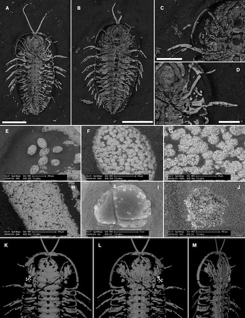 We now know that like the horseshoe crab, trilobites reproduced by seeding gametes from a pore in the head. We know that because fossilized trilobite eggs have been found in situ in Upstate New York, the results having been published in the journal Geology. These trilobite eggs are from the Ordovician, which followed the Cambrian. Their discovery is a first.
