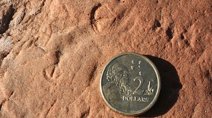 Photo: Parvancorina fossils, Australia, compared with a size of a coin, by EOL Learning and Education Group [CC BY 2.0], via Wikimedia Commons.