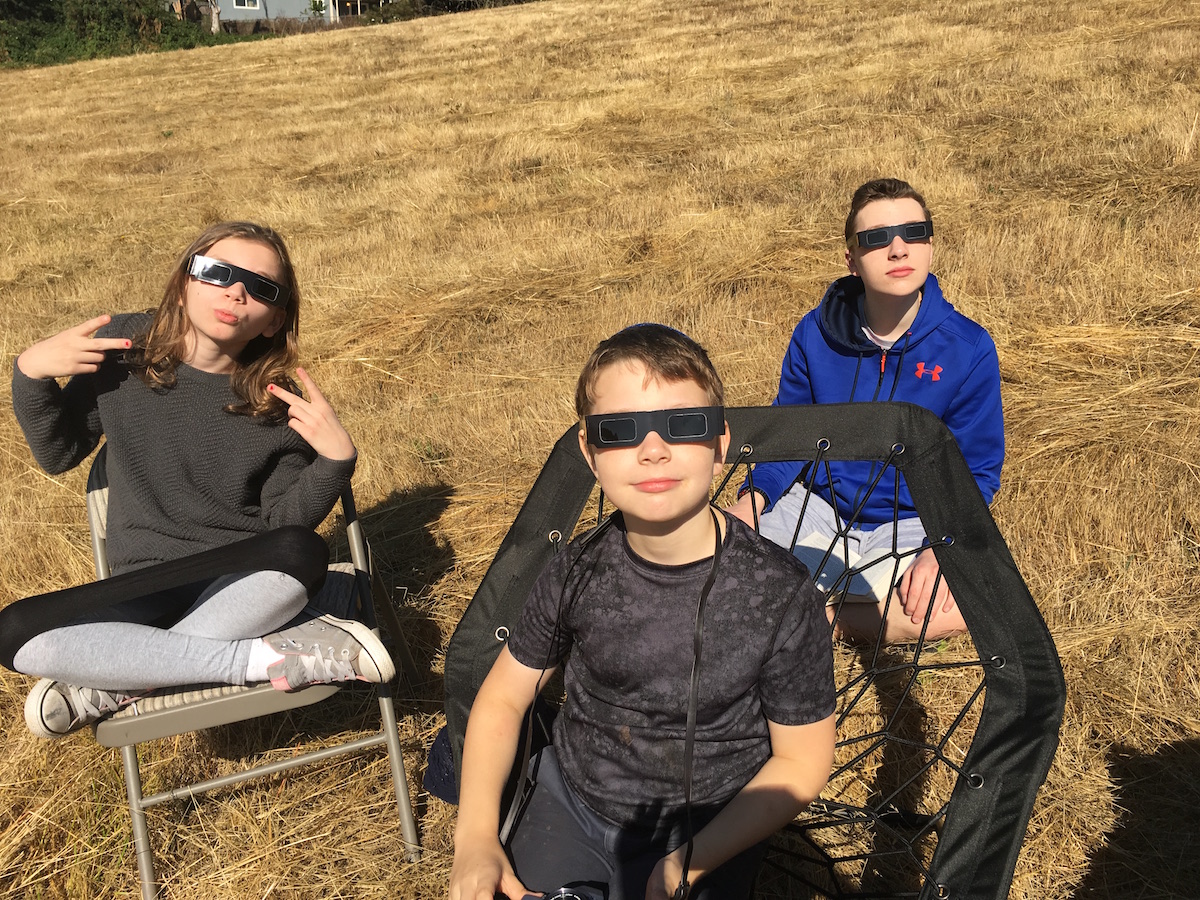 We had the opportunity to drive down to Salem, Oregon, to observe the eclipse with the Jewish community there, camping in a synagogue backyard. There were people visiting from as far away as Mexico, New York, and California. The rabbi’s wife took the best photo of the morning that I saw, with an iPhone, using two pairs of eclipse glasses as her filter.