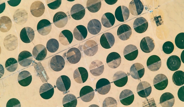 To make the circles pictured, water is drawn to the surface and sprinkled onto crops through slowly spinning pipes using a process called center-pivot irrigation.