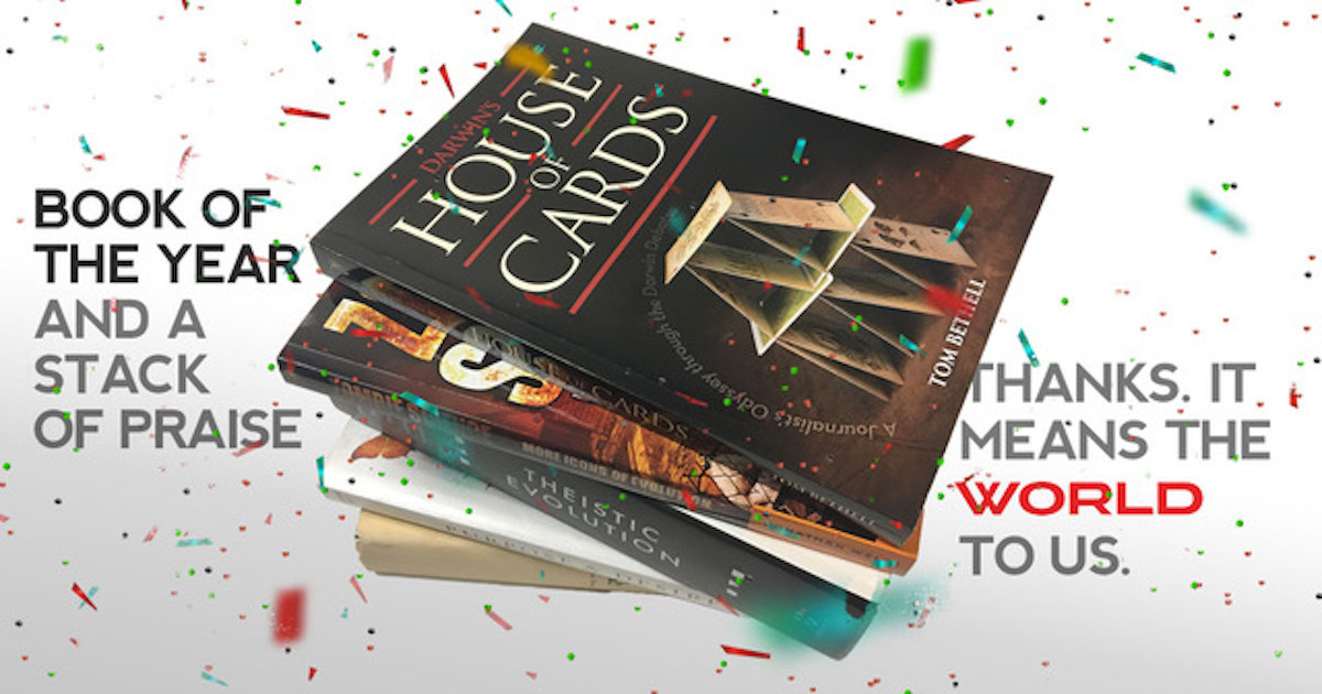 Against that backdrop, it’s satisfying to see Discovery Institute-related books and authors nearly sweeping World’s assessment of the best books of 2017 in the category of “Origins.” The top “best” book is Tom Bethell’s Darwin’s House of Cards (Discovery Institute Press), while the “short list” also includes the beautiful monster, Theistic Evolution, with numerous Discovery contributors and editors; Purpose & Desire, by our friend J. Scott Turner; Zombie Science, by Jonathan Wells; and Four Views on Creation, Evolution, and Intelligent Design, in which Stephen Meyer goes (graciously) head-to-head with prominent representatives of other perspectives on origins.