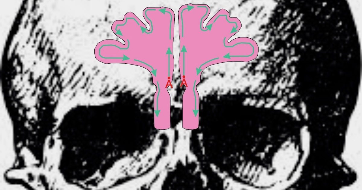 This is exactly correct. For example, consider our frontal sinus (see the image above for its location). Lents claims in his book that the frontal sinus (directly above the narrow between the eyes) “can drain downward.” This is true, but his implication is that frontal sinus drainage is primarily due to gravity. That is inaccurate.