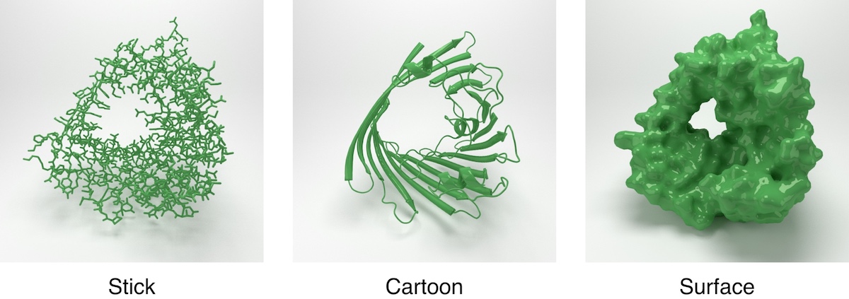 These proteins are pores in the membrane, holes to let compounds into or out of the cell. Not quite a wheel, they would be an uneven ride. The protein is shown here in three different ways: one showing every chemical bond (stick), one showing a cartoon of the protein’s secondary structure (the way the amino acids associate with one another), and one showing what the surface of the protein would look like to another protein, or a molecule trying to squeeze through its hole. Bacteria and mitochondria both have porins but not apparently of common origin.