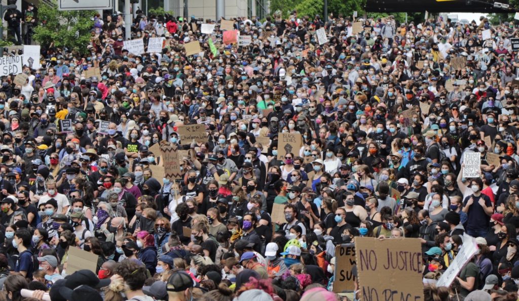 Photo: A June 3 protest in Seattle with minimal opportunity for social distancing, by SounderBruce, via Wikimedia Commons.