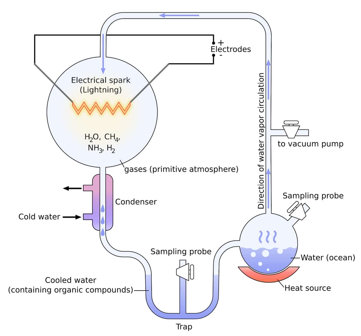 The Miller-Urey experiments were conducted in 1952–19531 and were celebrated as a great breakthrough in the search for a chemical pathway from gases assumed to be present in the early Earth’s atmosphere to chemical reactions that produced amino acids, the building blocks for protein molecules. This experiment (see the apparatus depicted below), and other similar experiments, have produced additional simple monomers — certain building blocks of life.
