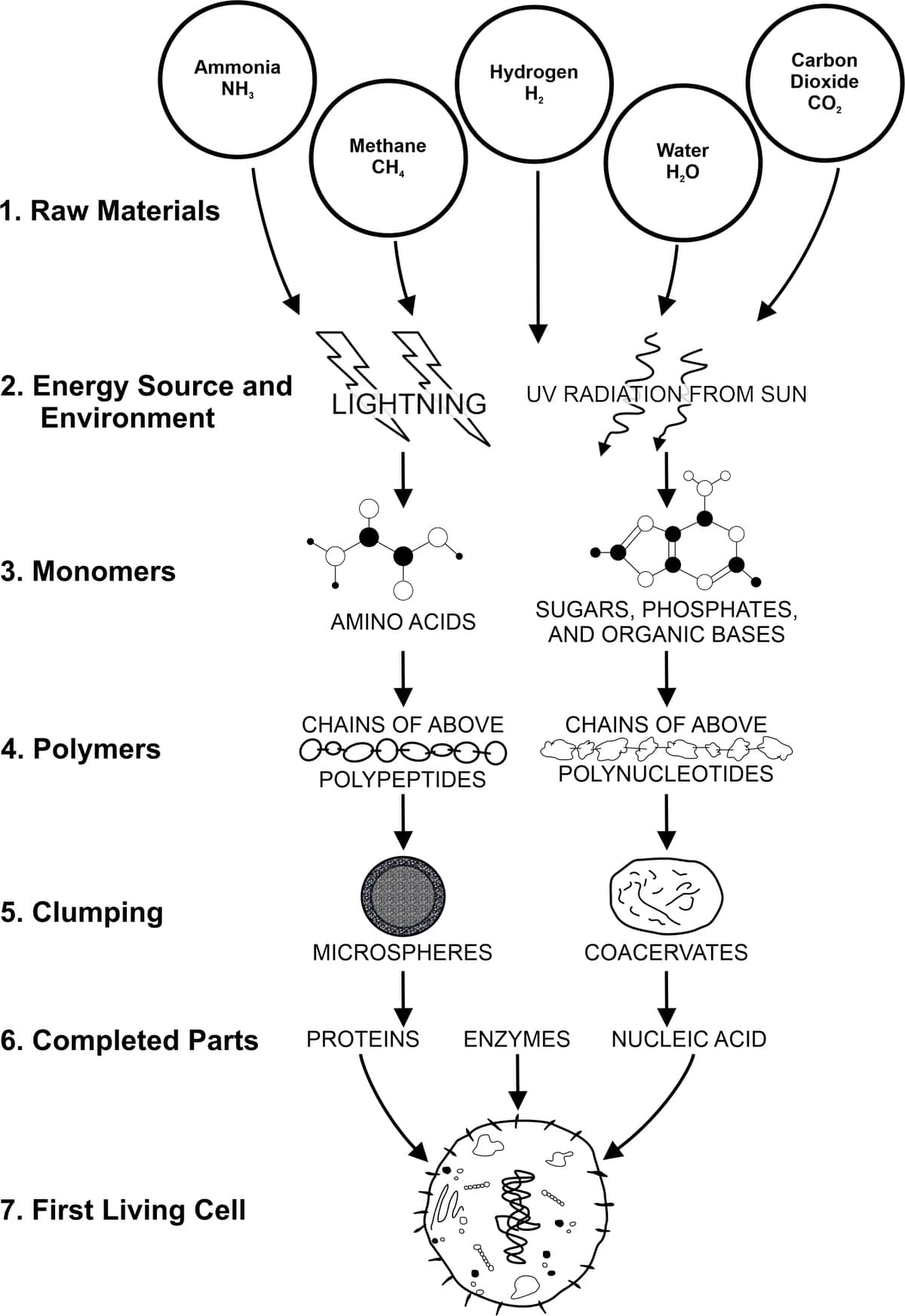 In 1929, the British biologist J. B. S. Haldane published a paper in the Rationalist Annual speculating on what initial conditions might be most favorable for a naturalistic origin of life.3 He imagined an early Earth atmosphere rich in gases that was acted upon by lightning that caused chemical reactions to produce various building blocks for life — such as sugars and simple amino acids. In Haldane’s view, these molecules might become sufficiently concentrated in oceans, or more likely in lakes and ponds, such that they could chemically react to form long polymer chains that today we know are the key components in living cells (i.e., protein, DNA, and RNA).4 In 1944, the noted quantum physicist Erwin Schrödinger observed that living systems are characterized by highly ordered, aperiodic structures that survive by continually utilizing (chemical or radiant) energy from their surroundings.5 In 1952, Harold C. Urey proposed that the Earth’s early atmosphere was rich in hydrogen, ammonia, and methane—chemicals that both provided the elemental building blocks and the energy to facilitate the chemical reactions necessary to make primary biopolymers, the chemical building blocks of life.6
