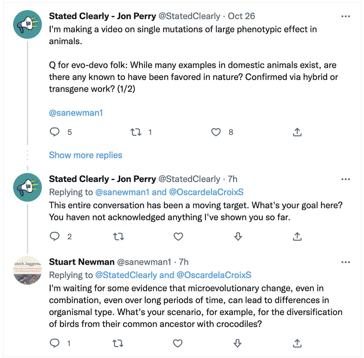 That’s background. A recent Twitter thread from Perry is worth a look. As he puts it, Perry is seeking evidence of “single mutations of large phenotypic effect in animals.” The examples provided by his respondents — e.g., loss of structures, changes in coat color — are interesting, Perry allows, but not on point. Then his exchange with biologist Stuart Newman, a “Third Way” evolutionary theorist who doubts neo-Darwinian theory, devolves into rhetorical heat, as you can see below: