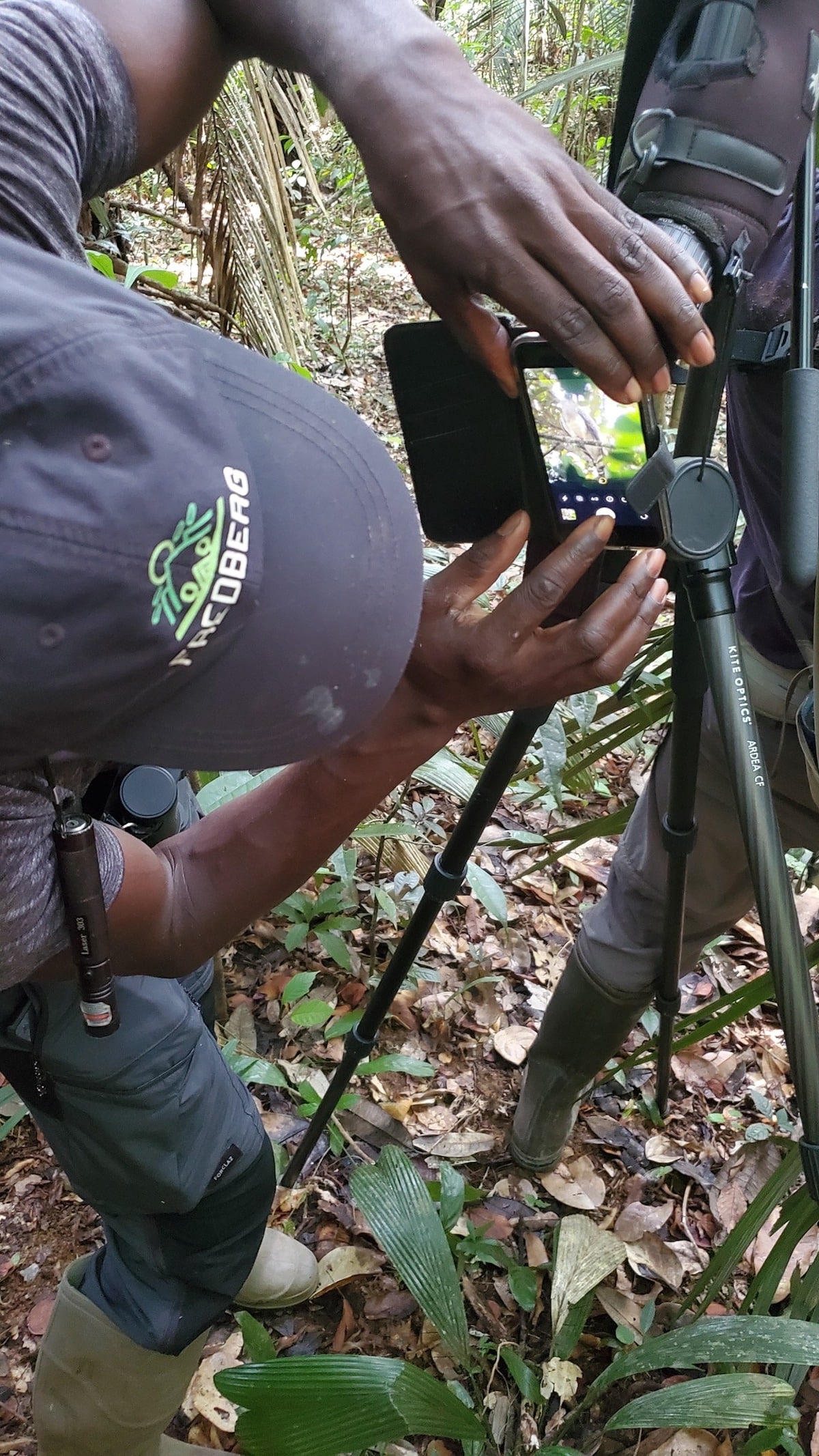 Finally, head still angled upward, Fred skidded to a halt and slammed his tripod down on a pile of dead leaves. He’d found it. He’d SOMEHOW tracked the thing like a quarter mile through the Amazon until it landed. Now it was time to look… (That’s Fred in the picture above btw.)