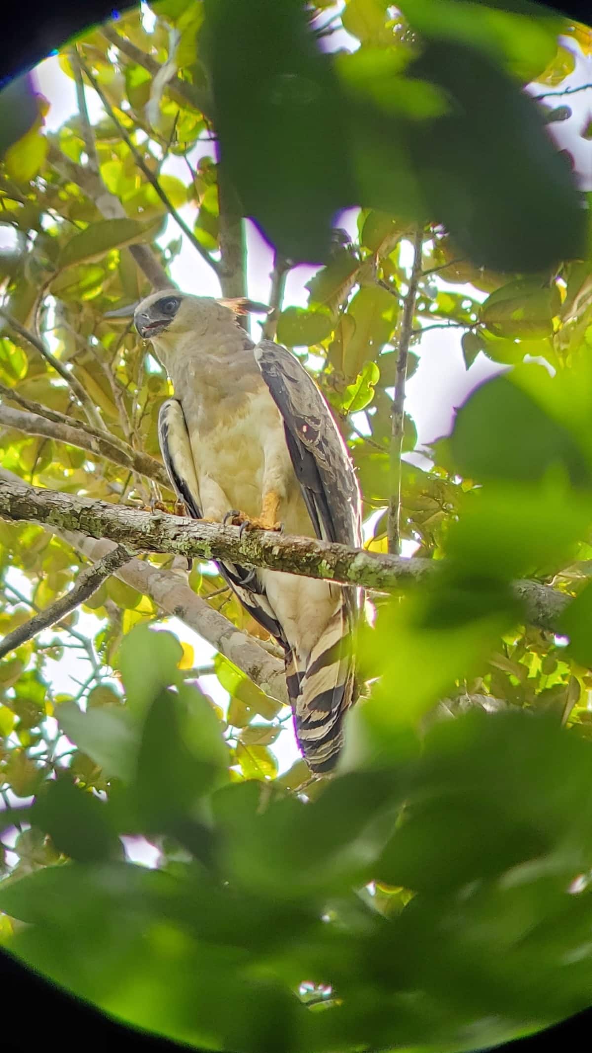 It got even more interesting once we looked through Fred’s telescope (although apparently the jury is still out on this). It turned out not to be a harpy eagle at all, but a crested eagle. Not as famous, but much rarer, to the point that this photo Fred took with my phone may have been one of the first ever photographs of the bird in Suriname. (According to Dovid, at the time we saw this, there were no photos of crested eagles taken in Suriname on eBird, the be-all-end-all gigantic online birding database.)