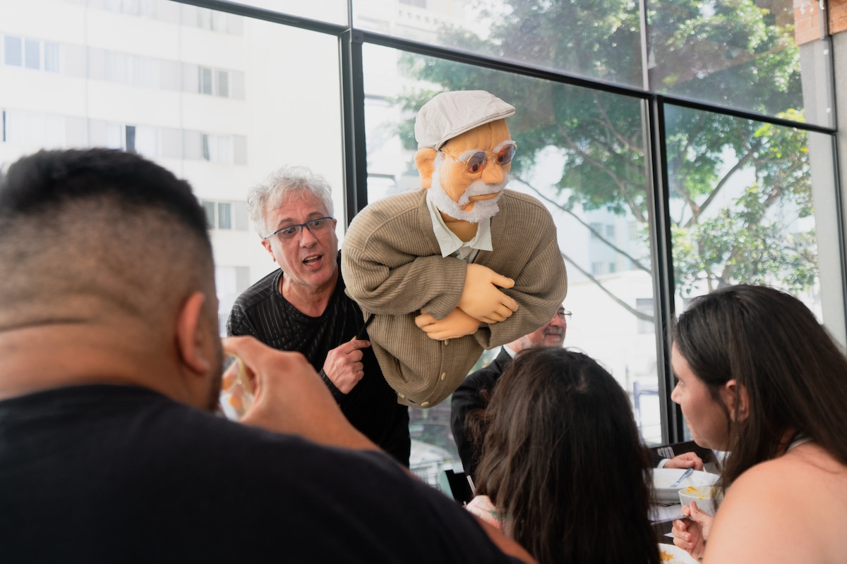 Speaking of Douglas Axe, it was fascinating to witness just how familiar this audience was with the work of early ID theorists like Philip Johnson, Michael Behe, Stephen Meyer, Jonathan Wells, Ann Gauger, and Bill Dembski, just to list a few names that I heard mentioned throughout the weekend. In many cases, they were spoken of as “intellectual heroes” and “scientific icons” in the eyes of the Brazilian ID movement. We were entertained to the point of tears when a life-sized Muppet-lookalike of Michael Behe made an appearance, taking pictures with delighted attendees and speaking of “complexidade irredutível,” “motores nanométricos,” and the “flagelo bacteriano.”