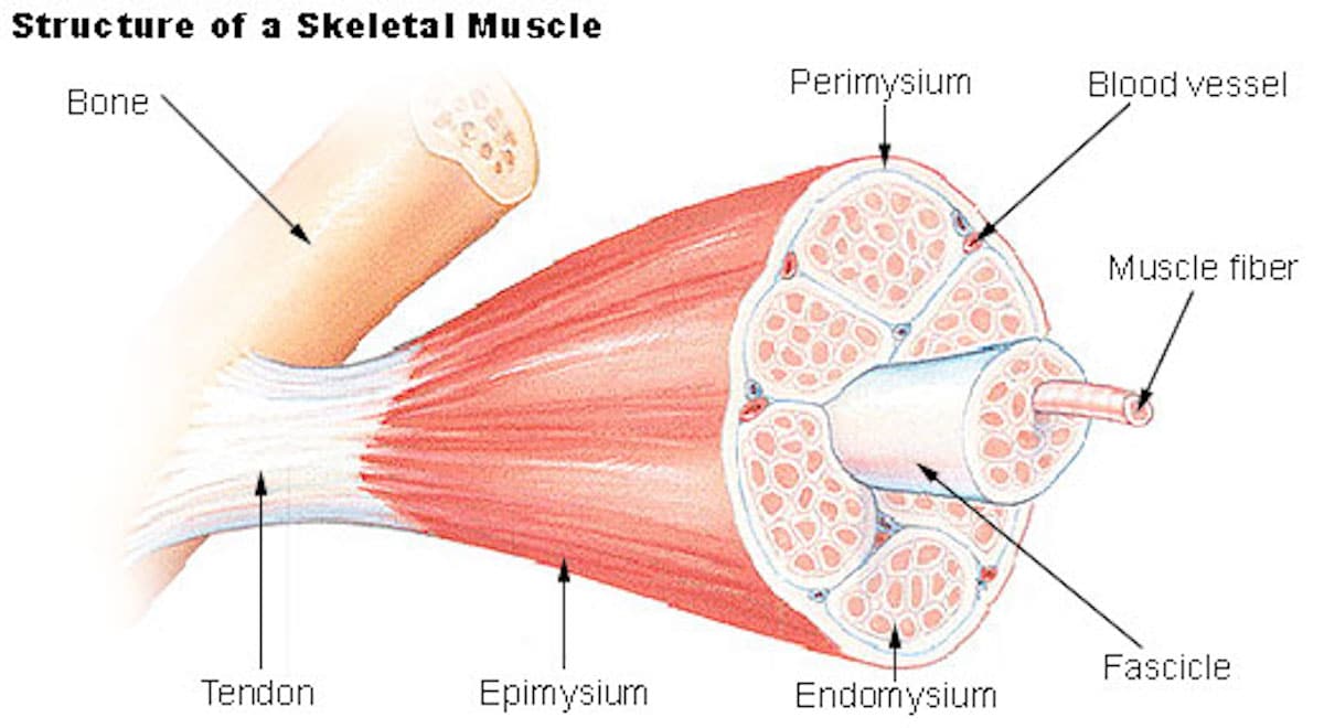 The muscle fibers are organized into bundles called fascicles. These fascicles are given structural support by a connective tissue that surrounds them called the perimysium. The perimysium also protects and distributes the blood vessels and nerves that supply the muscle, in addition to facilitating the transmission of forces generated by muscle contractions. Together with the endomysium (connective tissue that surrounds individual muscle fibers) and the epimysium (connective tissue that surrounds the entire muscle), the perimysium helps to maintain the overall integrity and organization of the skeletal muscle. The structure of skeletal muscles is shown in the figure below: