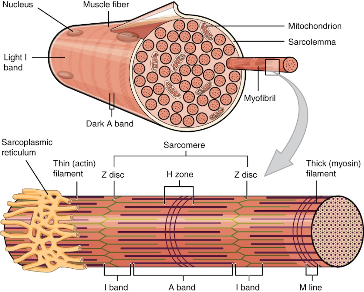The muscle fiber contains thousands of individual contracting units known as sarcomeres. These are organized end-to-end in cylinders known as myofibrils. In the center of the sarcomere are thick filaments comprised predominantly of the protein myosin, and thin filaments containing actin can be found at the ends, attached to the end boundaries of the sarcomere (known as the Z discs) by the protein titin. The structure of the muscle fiber is shown in the figure below: