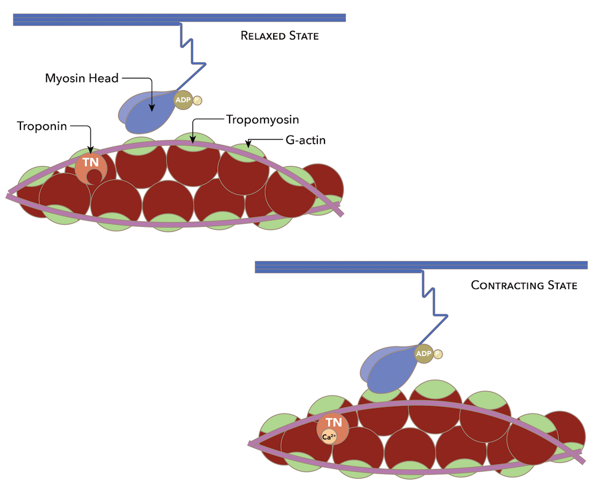 Muscle contraction is driven by two contractile proteins — myosin and actin. Each myosin molecule consists of a long tail and a globular head. Myosin heads have ATPase activity, which allows them to hydrolyze ATP to generate energy for muscle contraction. Myosin heads also have binding sites for actin and ATP. Actin has binding sites for myosin heads. However, these binding sites are typically covered by two inhibitory proteins known as tropomyosin and troponin when the muscle is relaxed. These inhibitory proteins prevent the sliding of myosin and actin during relaxation of the muscle fiber.