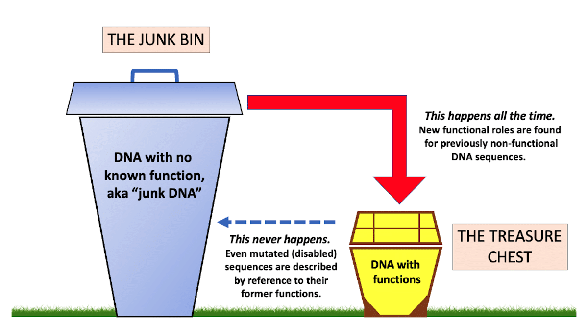 Out on the lawn sit two containers: a large waste bin and a smaller treasure chest (see the illustration). The bin is labelled “DNA with no known function, aka junk DNA.” The treasure chest has the label “DNA with functions.” Curious, we inspect these two containers daily for months. We notice that DNA sequences are regularly being moved from the larger into the smaller container — but never in the other direction. DNA labeled as non-functional may on closer investigation turn out to have functions. Once a role has been assigned to a sequence, however, and it is placed in the functional treasure chest, there it stays. All the traffic flows in one direction.