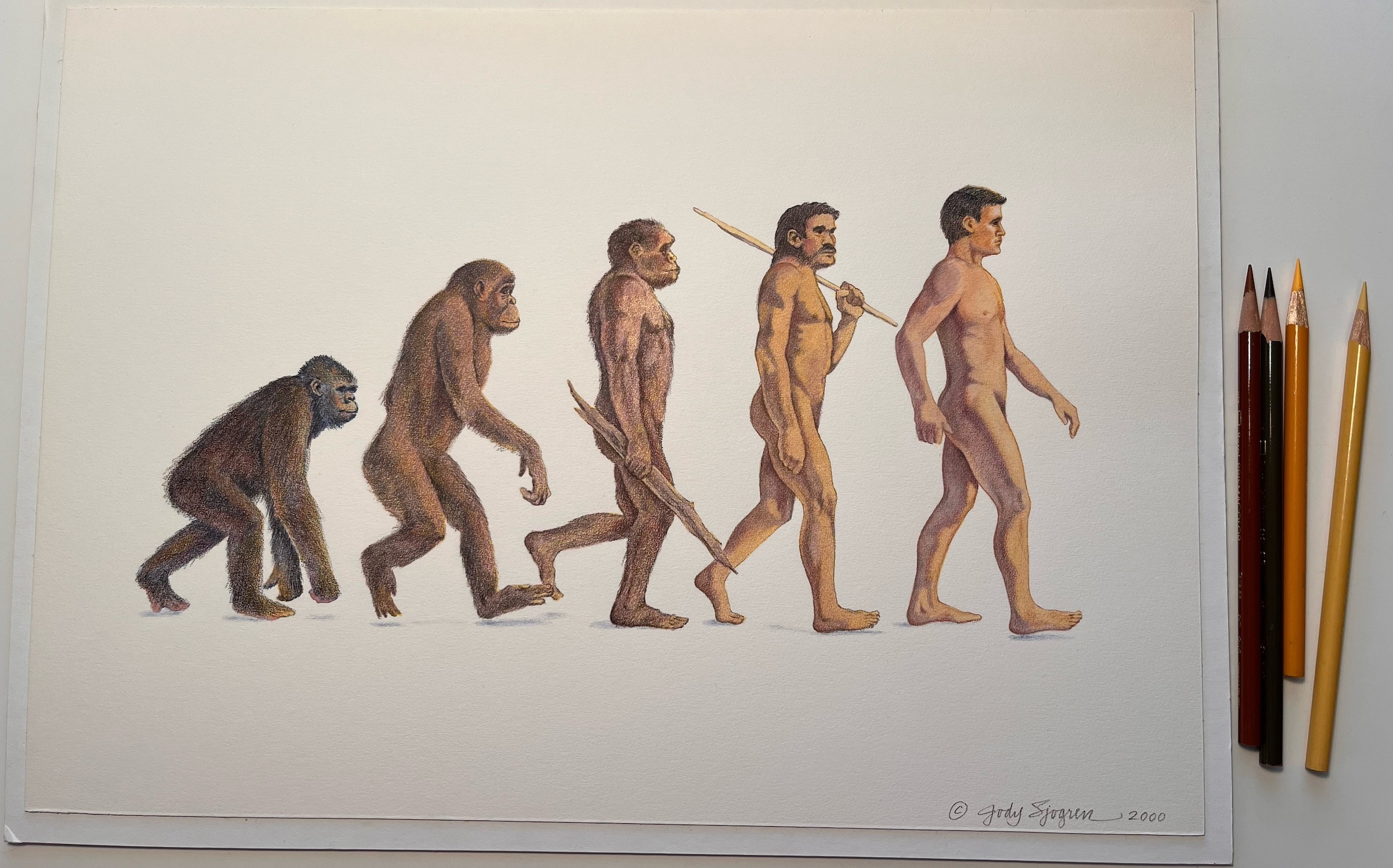 Incidentally, I was thinking about the time back in the year 2000 when I was working on this ape-to-human drawing for Jonathan’s book. Having been trained as a medical illustrator, and having worked in that field for many years, I was accustomed to researching everything for scientific accuracy as I was constructing an illustration. This one was giving me fits, because I wasn’t sure what was “right and accurate” in the various figures that make up this metamorphosis. So, I called Jonathan and explained my dilemma. His response was “Oh Jody, just make something up. It’s just a figment of their imagination anyway.” So, that relieved me of the need for technical accuracy, and I went ahead and made up the ape figures and the “golden boy.” To my deep regret, I succeeded in creating such a piece of art that various evolution-friendly propagandists have found it useful, and have used it liberally without my permission (in violation of copyright, I might add). Later it occurred to me that the evolutionists have been propagating, as fact, ridiculous figments of an artist’s imagination, ever since the time of Darwin. In fact, all of the “icons of evolution” are just that — the work of an artist’s mind and hand! The Darwinists have used artists incredibly effectively to promote their theory, and they couldn’t have done so without those visual images — and the artists who created them. Jonathan’s great genius was in recognizing the power of these “icons of evolution.” And he called their bluff.