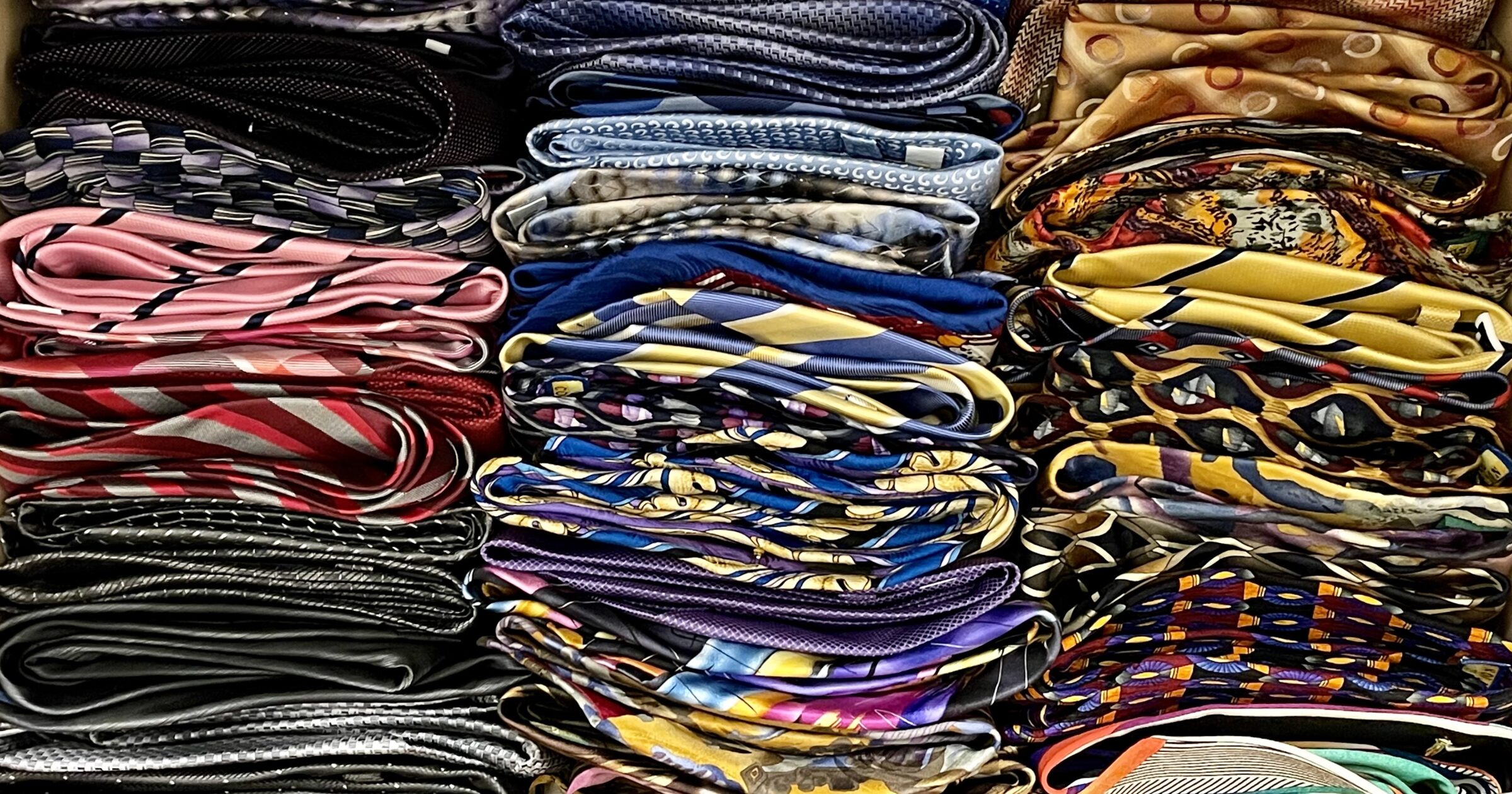 I have a similar thought-game that I play with students in an introductory chemistry class I teach. When we begin the study of protein synthesis, I show them a photograph of my necktie drawer (the photo at the top) before my wife spent an hour organizing it by folding all of the ties and neatly arranging them in three rows according to color (below). No student has ever thought that this happened by blind, unguided chance nor could it ever happen this way given any amount of time.
