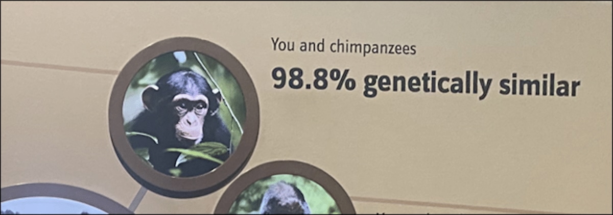 As our understanding of DNA has increased, we have come to understand that we share around 98.8 percent of our gene sequence with chimpanzees. This is striking evidence for chimps and chumps to have a common ancestor.
