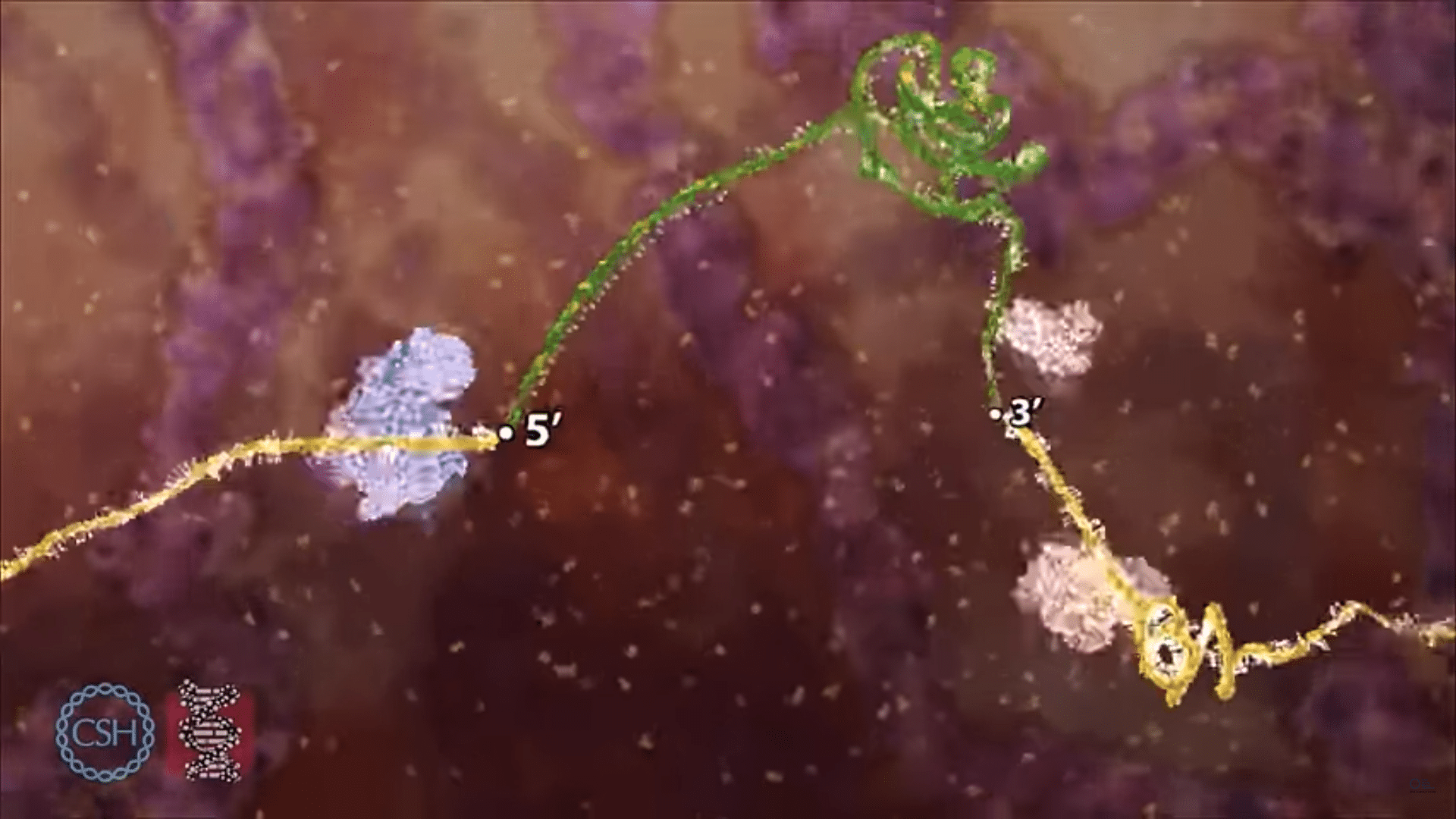 Introns (which, unlike exons, do not code for proteins) can be of considerable length in higher eukaryotes, even spanning many thousands of bases and sometimes comprising some 90 percent of the precursor mRNA.1 In contrast, lower eukaryotes such as yeast possess fewer and shorter introns, which are typically fewer than 300 bases in length. Since introns are the non-coding segments of genes, they are removed from the mRNA before it is translated into a protein. The introns are excised from the pre-mRNA transcript, and the exons are spliced together by a riboprotein complex called the spliceosome.2,3 This remarkable process is illustrated by the animation below: