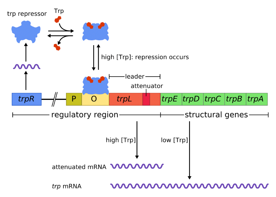 As shown in the diagram above, when tryptophan is abundant, it binds to the repressor. This causes a conformational change, facilitating the repressor’s binding to the operator sequence (labelled “O”), which is downstream of the promoter (labelled “P”). This blocks the RNA polymerase from transcribing the Trp operon.