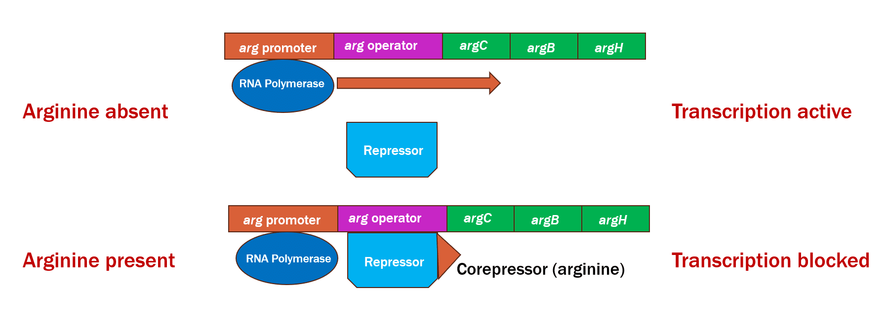Just like the tryptophan operon, the repressor only docks to the operator when it is bound by arginine. By associating with the operator, the RNA polymerase is inhibited from transcribing the genes needed for the biosynthesis of arginine.
