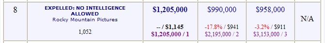 Expelled had a huge opening weekend for a documentary film. According to Box Office Mojo, the film was #8 for the weekend, raking in a whopping $3.15 million overall.