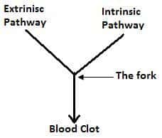 Figure 1: Rough sketch of the intrinsic and extrinsic pathways of the blood-clotting cascade: