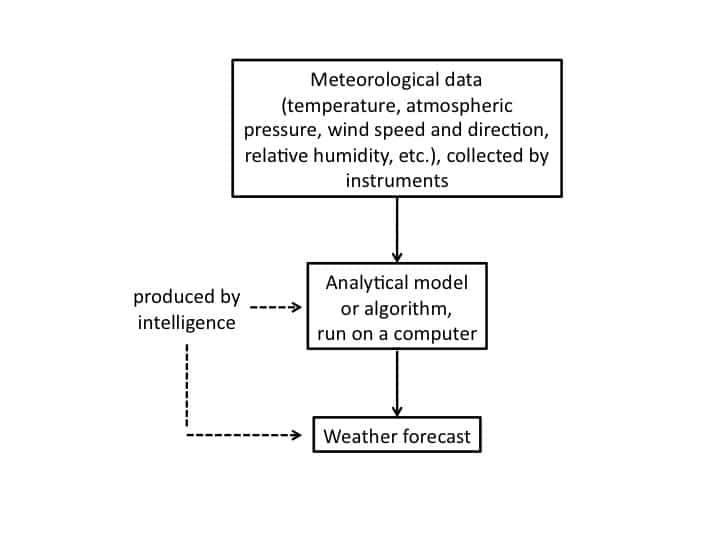 By contrast, in real weather forecasting, data only become complex specified information — that is, genuine predictions — by passing through an intelligently-designed algorithm: a computer model, in most instances. But the measurements themselves don’t give us the model. They can’t.