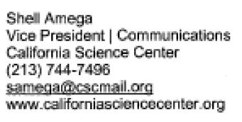 Indeed, the California Science Center’s website is full of examples of pages that list Shell Amega as the media contact for the “California Science Center”–with no mention of her working for the “Foundation.” For just a few of many examples which list Amega as working for the “California Science Center,” see: