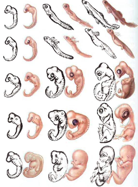 These particular texts commendably do not use Haeckel’s drawings, but instead use photographs of embryos. However, there are textbooks in use today, such as Mader’s 2010 edition of Biology, which continue to use Haeckel’s drawings (in Mader’s case, essentially a colorized and slightly altered version of Haeckel’s drawings) and state, “At these comparable developmental stages, vertebrate embryos have many features in common which suggests they evolved from a common ancestor.”271 Indeed, a textbook submitted by the J.M. Lebel publishing company for adoption in Texas in 2003, stated, “All vertebrate embryos closely resemble one another in early development” and used a slightly simplified version of Haeckel’s original fraudulent drawings.272 Thus, Haeckel’s embryo drawings are still used to illustrate a purportedly valid point, namely that vertebrate embryos share early developmental pathways, and that this provides evidence for their shared ancestry. But the evidence shows that the earliest stages of vertebrate embryo development often have important differences that are left out of textbooks.