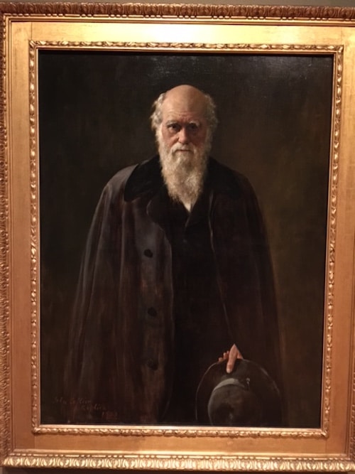Our friend the Seattle radio host David Boze has been traveling in England and thought of us. He sent back some interesting holiday snaps. Here, for example, is the iconic Darwin portrait by John Collier at the National Portrait Gallery, followed by a caricature of Darwin showing a monkey its reflection in a mirror.