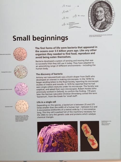 This display notes how a “tiny” bacterial cell “is packed full of the machinery necessary for life: DNA to carry the genetic code and proteins which catalyse chemical changes”: