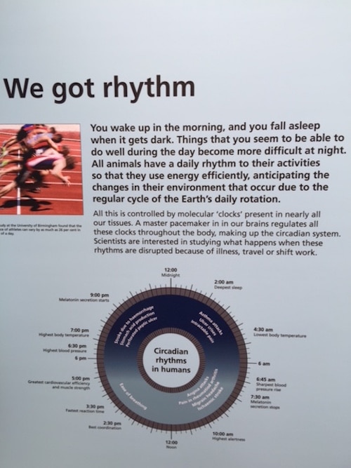 Under the title “We got rhythm,” this one explains how the cycle of sleeping and waking “is controlled by molecular ‘clocks’ present in nearly all our tissues. A master pacemaker in our brains regulates all these clocks throughout the body, making up the circadian system”: