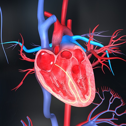 The heart is a muscular pump that is divided into a right and left side by a wall called the septum. Each side of the heart consists of a thin-walled upper chamber, called the atrium, and a more muscular lower chamber, called the ventricle. There are “V”-shaped one-way valves that point in the direction of blood flow between the atria and the ventricles, and the ventricles and their outflow tracts. When the valves open, they direct blood forward to where it is supposed to go. When they close, they prevent blood from going backward to where it is not supposed to go.