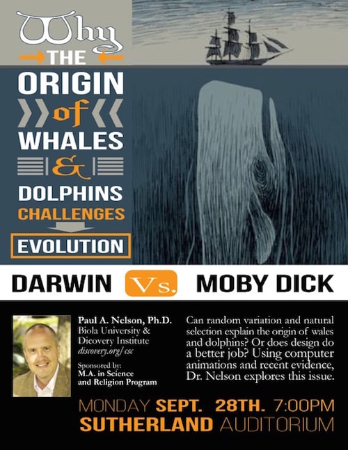 Starting in Bloomington, Minnesota, next Monday, and then moving on to the Austin, Texas area and later, Los Angeles, Discovery Institute Fellow Paul Nelson will present a series of lectures for a general audience about the enthralling puzzles of whale and dolphin origins. Dr. Nelson’s theme: “Moby Dick Versus Darwin.”
