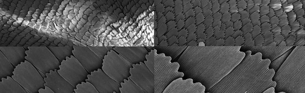 As Illustra showed with electron micrographs, the wings are composed of scales that overlap like shingles on a roof. The scales, made of the protein chitin, begin as individual cells. The cells must manufacture chitin and place it in the right orientation. The scientists found that the crystals of chitin are strongly oriented normal to the plane of the scale (i.e., perpendicular). The crystals apparently grow from the edges of the cell toward the middle, where they meet at domain boundaries.