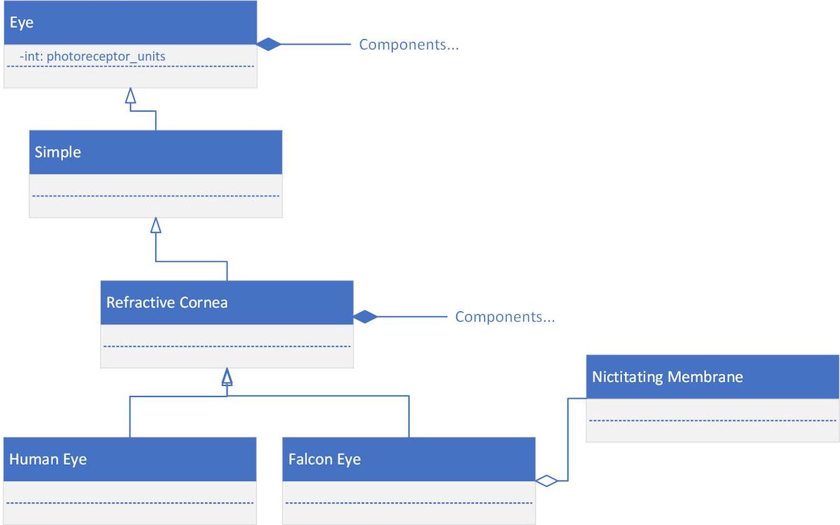 So, let’s now look at the simplified class hierarchy for human and falcon eyes. At the level of instantiation, where we find the Human Eye and Falcon Eye classes below, they must implement the component interfaces of the Eye and Refractive Cornea specific to their species. In the case of the Falcon Eye class, it also aggregates the Nictitating Membrane class that is associated with it as a species (and other species of birds as well, such as the bald eagle).
