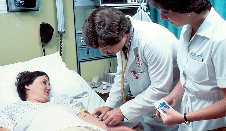 Photo: Doctor draws blood from a patient while explaining the importance of evolution for his healing practice, by Linda Bartlett [Public domain], via Wikimedia Commons.