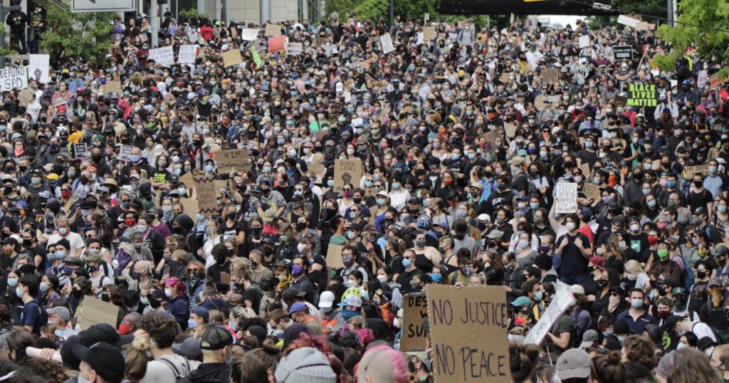 Photo: A June 3 protest in Seattle with minimal opportunity for social distancing, by SounderBruce, via Wikimedia Commons.