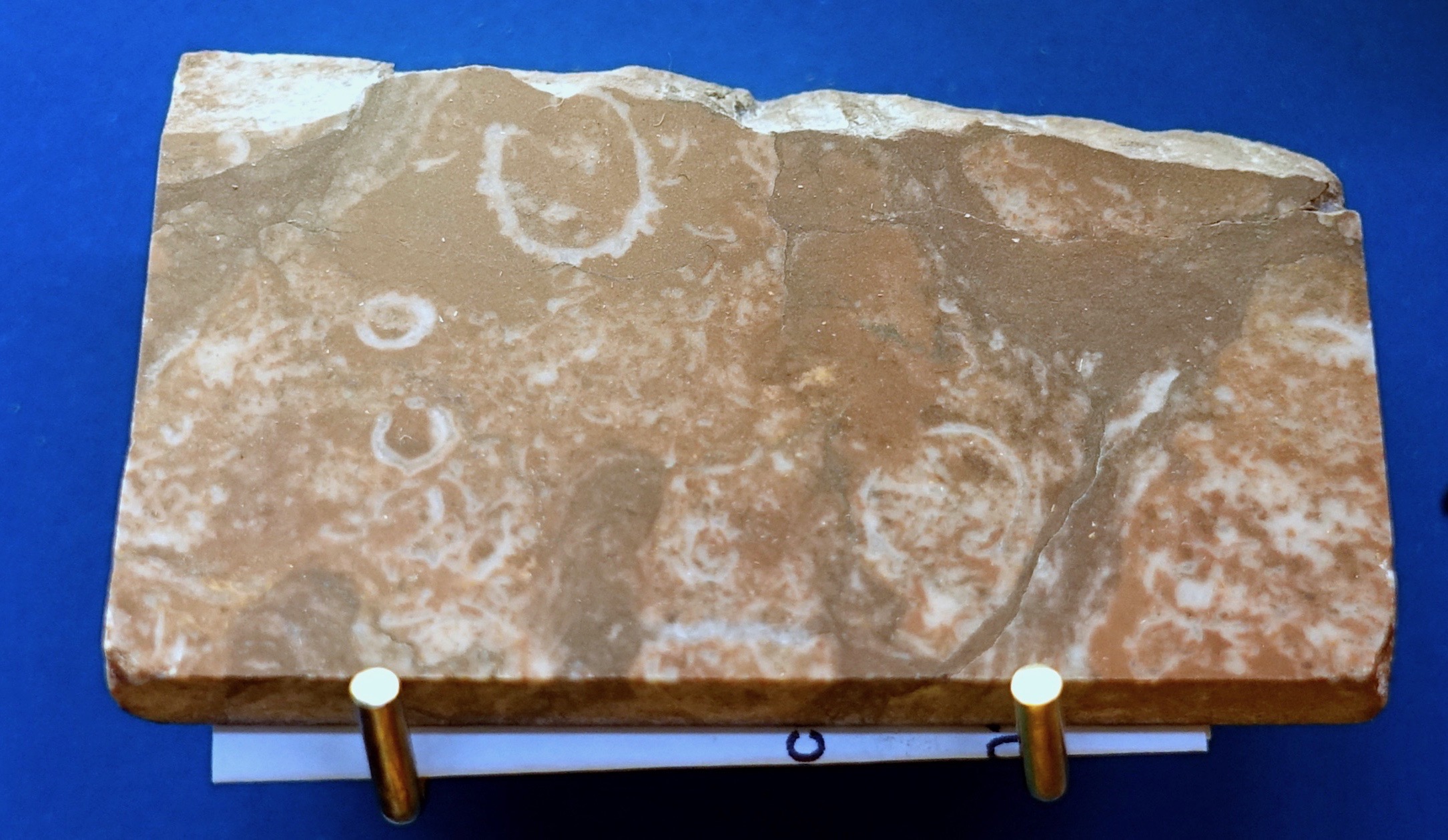 Namacalathus hermanastes is a 5-50 mm long and 2-35 mm wide, goblet-shaped organism with a hollow stalk carrying a hollow bulbous cup that has a wide apical opening at the top and a series of about six (5-7) openings around the side of the cup. Namacalathus was a solitary organism but is found in dense aggregations in fills between stromatolites and thrombolite reefs. The walls of its skeleton are very thin (ca. 100 μm thick), triple-layered with two thin inner and outer layers encasing a thicker inner layer comprising irregularly arranged rod-like crystals. The skeletons originally were aragonitic rather than calcitic (Wood 2011, Pruss et al. 2018), and later underwent diagenetic conversion into high-magnesium calcite, which is probably related to a different seawater chemistry in the Ediacaran and earliest Cambrian eras (Porter 2007, Zhuravlev & Wood 2008). Brasier et al. (2011) proposed that living Namacalathus could have been unmineralized and that its fossils are based on “tufa-like” abiogenic encrustation, but this was refuted by other studies (Zhuravlev et al. 2012).