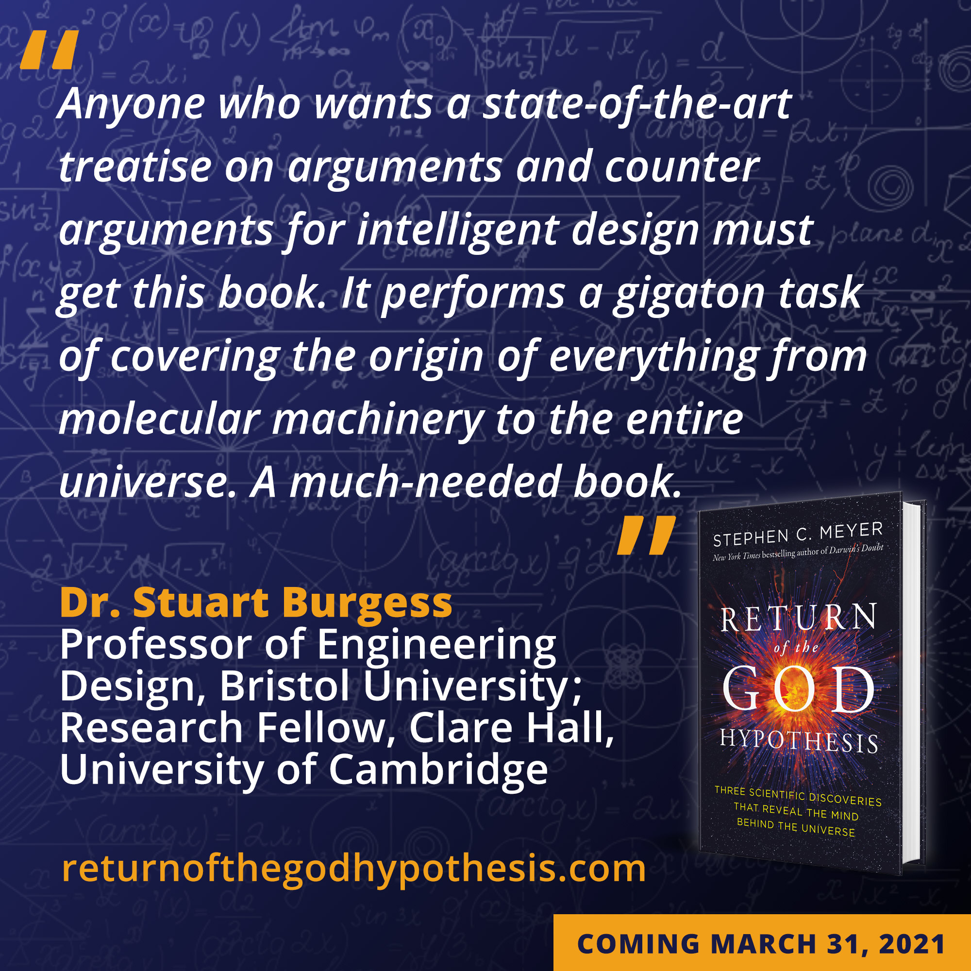 Here’s the latest praise from a distinguished scientist — Stuart Burgess, of Cambridge and Bristol universities — who says the book “performs a gigaton task of covering the origin of everything from molecular machinery to the entire universe.” A gigaton, in case you wondered, is a measure of explosive power, “how many billion tons of TNT would be needed to produce the same energy.” That’s a lot of energy to put between two covers.