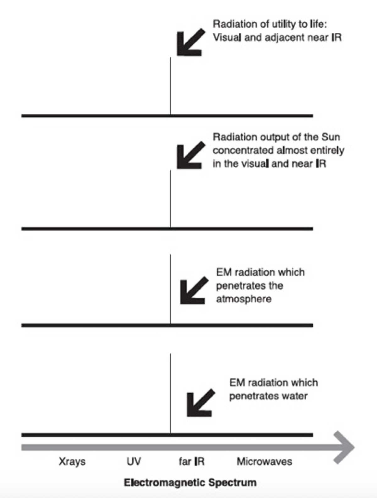 Similarly, there is no connection between the laws of nature which determine the tiny size of the biologically useful region in the electromagnetic spectrum, and those laws which determine the radiant output of the sun. And there is no connection between the radiant output of the sun and the laws determining the absorption properties of the atmospheric gases and liquid water.
