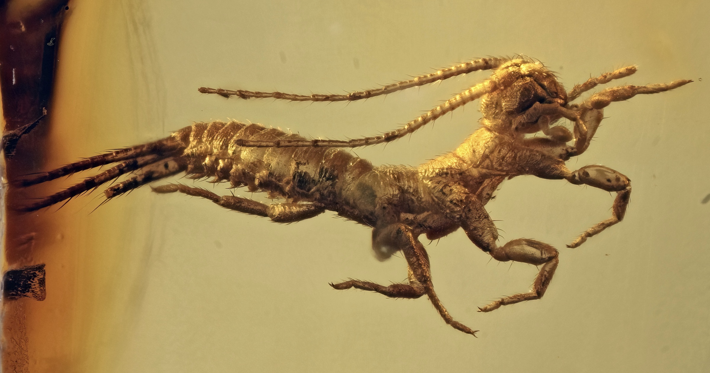 I photographed this very interesting little critter in 2013 at a German private collection (coll. Carsten Gröhn, no. 1623), which will be inherited by the Centrum für Naturkunde at the University of Hamburg. The insect is preserved as an inclusion in Eocene Baltic amber, which is a fossil conifer resin that is about 34-37 million years old. It is only 2.5 mm long, thus likely representing an early nymphal instar. It belongs to the wingless insect order Zygentoma (silverfish), which is a small group of only 470 species that are classified in seven families. They are very rarely found as fossils (Mendes & Wunderlich 2013), but this specimen is an even more remarkable scientific novelty, which is here revealed for the first time. Therefore, please allow me to get a bit technical for the specialists.