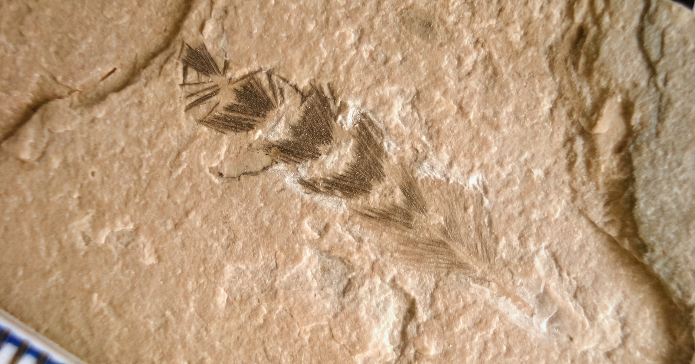 This Fossil Friday features a beautiful fossil feather from the Lower Cretaceous Crato limestones of northeast Brazil, which are about 115 million years old. I photographed this fossil at a German trader collection in July 2008. The feather with preserved color pattern could have belonged to a primitive bird or a feathered theropod dinosaur, which coexisted at this time in Earth history. Actually, the origin of pennaceous feathers represents another striking example of the waiting time problem as an obstacle to neo-Darwinian evolution. The rich fossil record of the dinosaur-bird transition shows that there are only a few million years available for the transformation of hair-like dino-fuzz into real bird feathers. This window of time corresponds to only about the average longevity of a single species, but has to accommodate the origin and fixation of multiple coordinated mutations to allow for the formation of vaned feathers, which are considered the most complex integumental structures in the animal kingdom.
