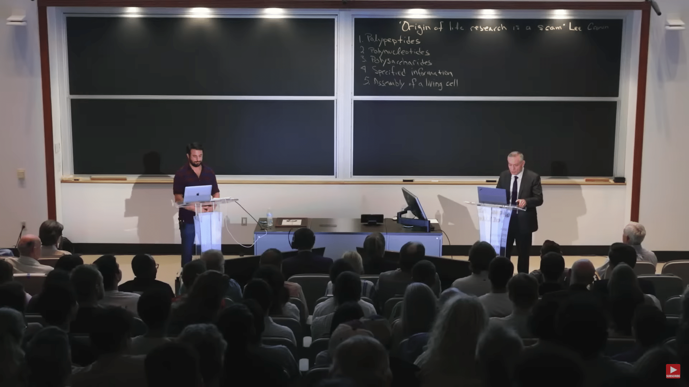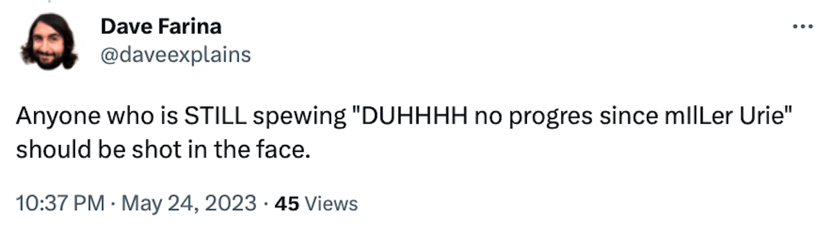 An alarmist might be calling the police about now. It’s one thing to say that the other side in a debate should be “laughed off the stage,” or what have you, but… “shot in the face”? Now, just under a week after YouTube personality Professor Dave’s poor showing (see here and here) in the origin-of-life debate at Rice University with James Tour, it sure looks as if he is inciting his fans to violence. I mean, taking him at face value. He tweeted: “Anyone who is STILL spewing ‘DUHHHH no progres since mIlLer Urie’ should be shot in the face.”
