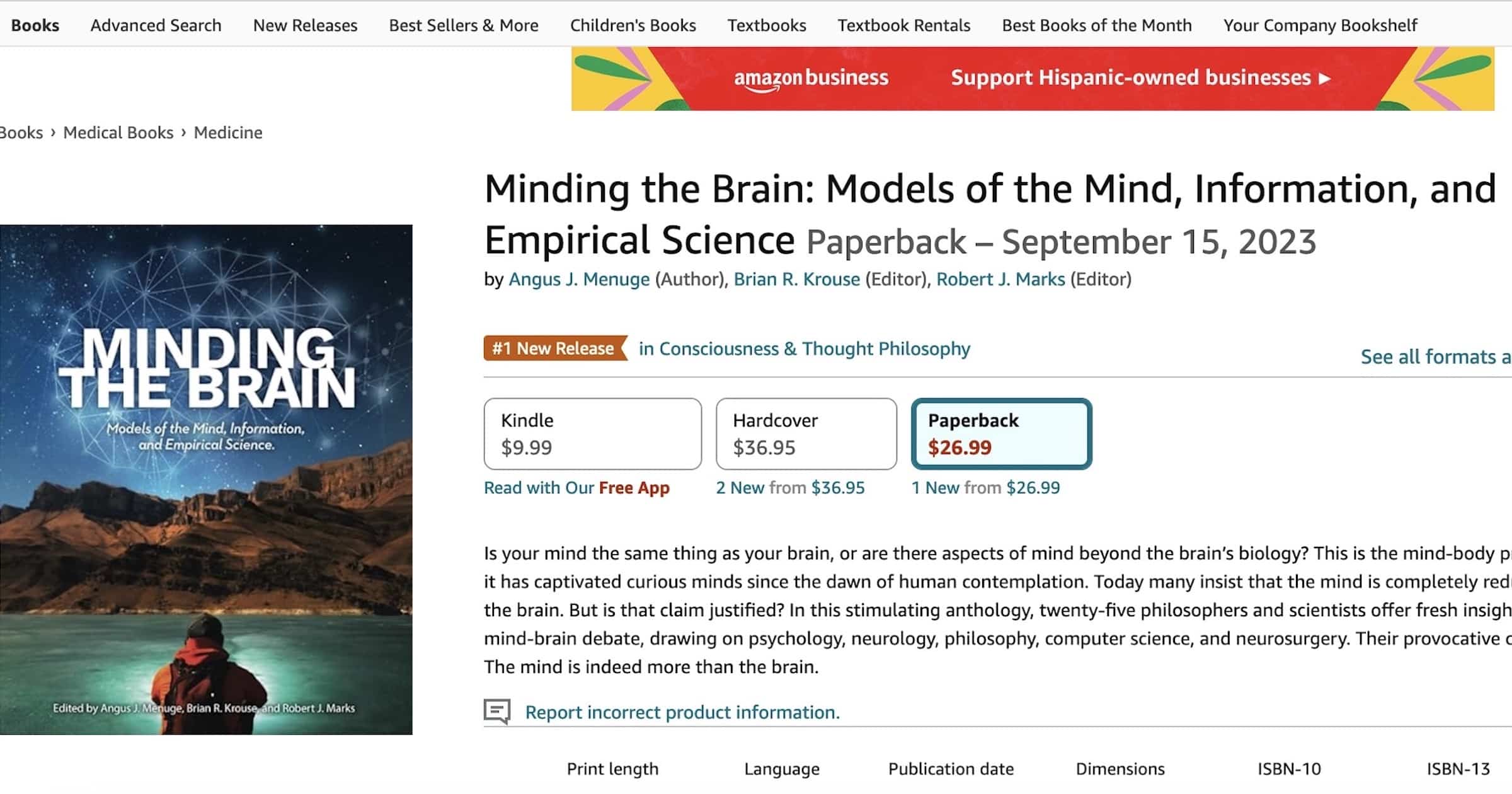 The latest release from Discovery Institute Press is a #1 new release on Amazon, in the bookseller’s “Consciousness & Thought Philosophy” section. Congratulations to the editors of Minding the Brain: Models of the Mind, Information, and Empirical Science — Angus Menuge, Brian Krouse, and Robert J. Marks!