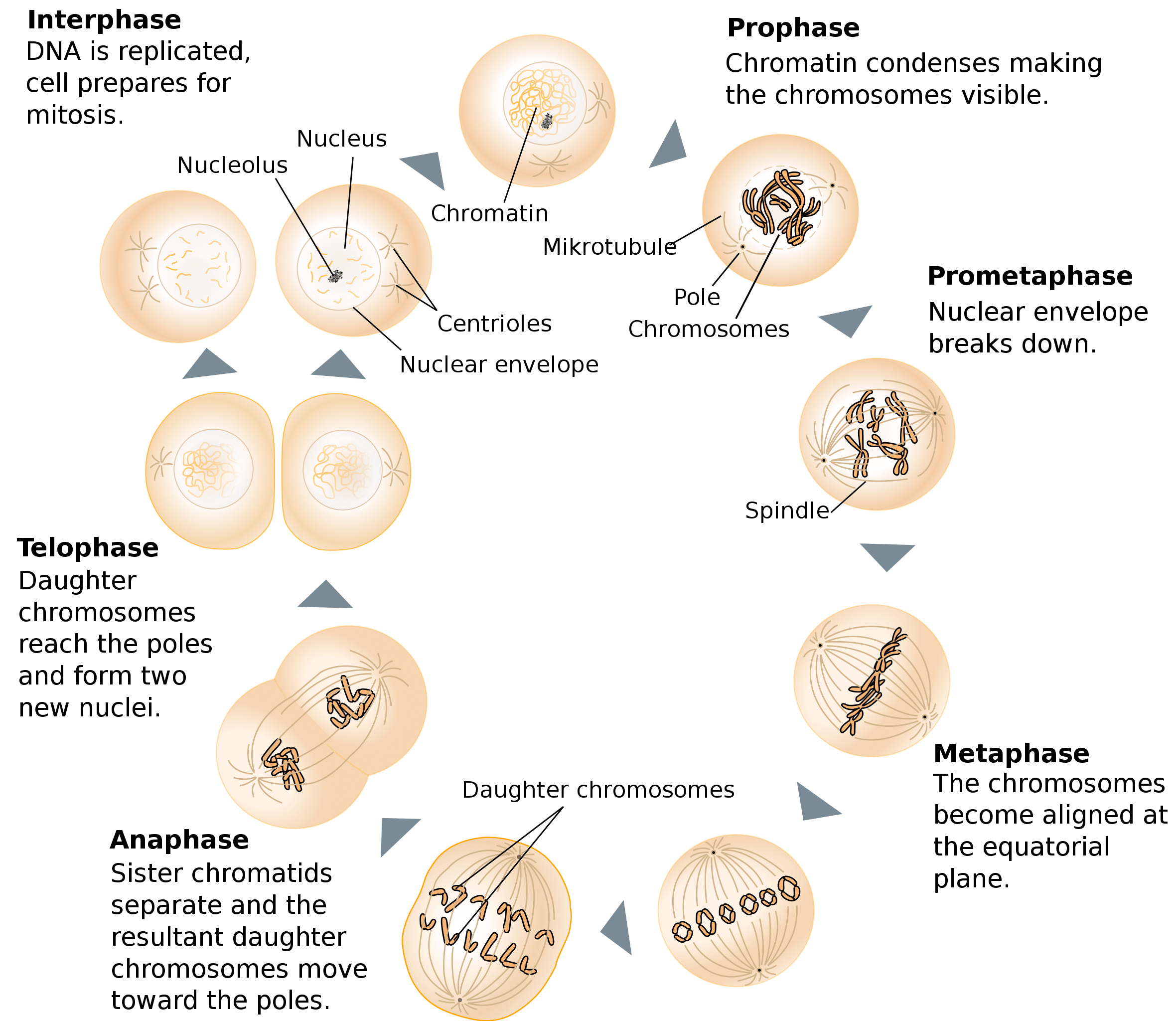 Mitotic division (“M phase”) is the culmination of the eukaryotic cell cycle for somatic cells. Mitotic cell division is divided into six phases, illustrated in the figure above. The first is prophase, which is characterized by chromosome condensation (the reorganization of the sister chromatids into compact rod-like structures). Following condensation, assembly of the mitotic spindle apparatus occurs outside the nucleus between the two centrosomes which have duplicated and moved apart to the poles of the cell.